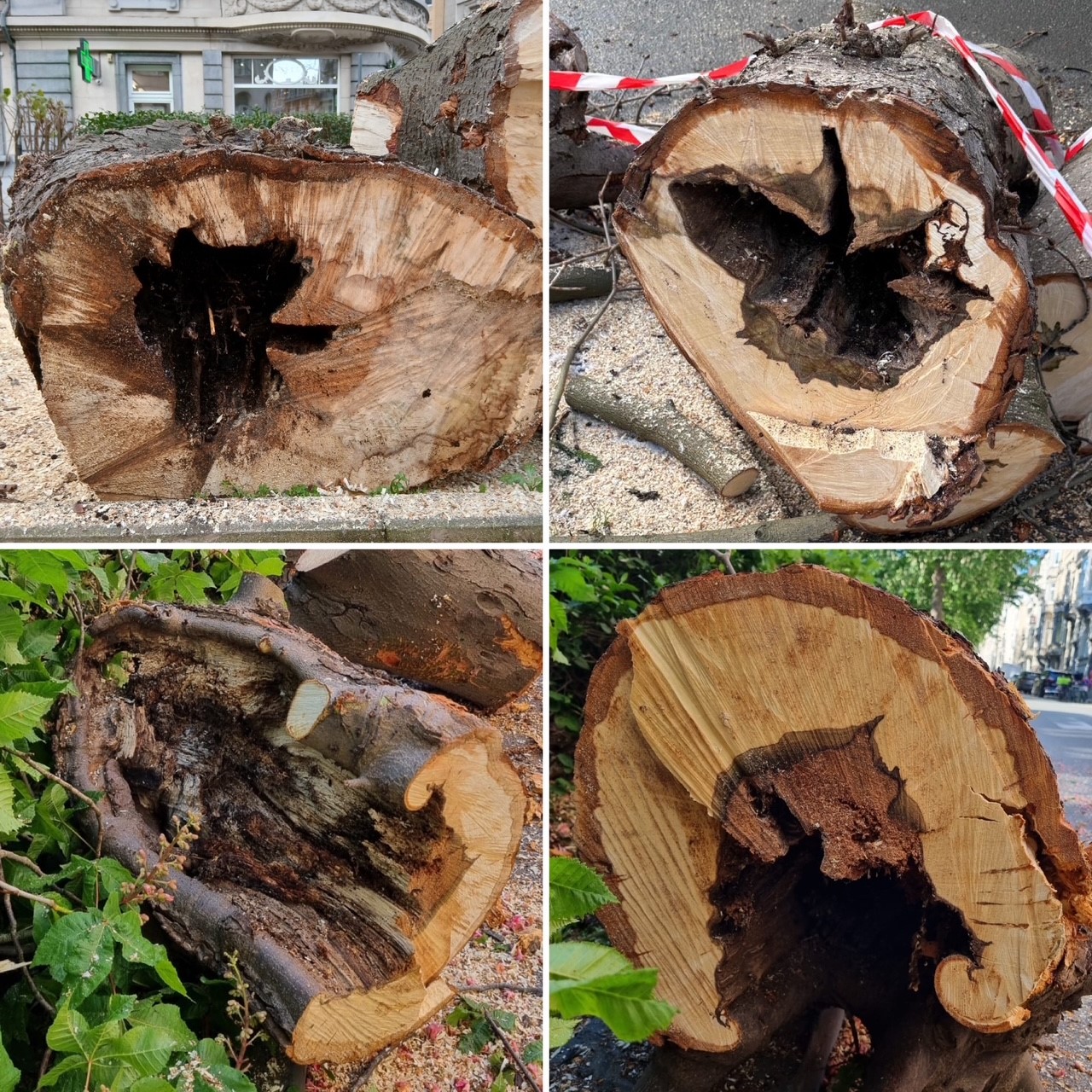 Au cours des deux dernières années (2024 et 2025), trois arbres au sein de ces deux alignements ont connu une rupture catastrophique de leur tronc, et l’ensemble de leurs couronnes (qui incluaient de très grosses branches de plusieurs centaines de kilos) est tombé sur la voirie.